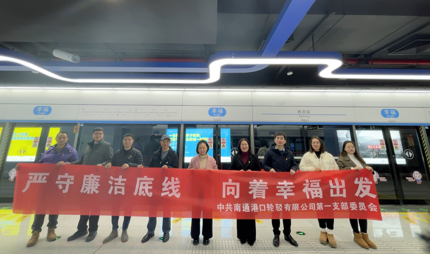 隨后,大家共同乘坐新開通的地鐵2號線前往幸福站,切身感受著南通城市發展的新速度。支部黨員在幸福公園“幸福都是奮斗出來的”的宣傳標語下,寫下了對新的一年的期望,并將寄托心愿的風鈴掛上了象征崇高美好的桂花樹,提醒自己守牢廉政底線,以奮斗贏得未來幸福美好生活。