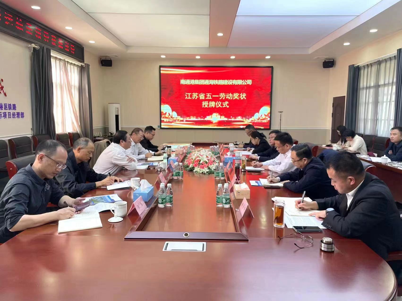 10月10日上午,南通市交通運輸局在南通港疏港鐵路一期工程一標段項目部舉行“江蘇省五一勞動獎狀”授牌儀式,市交通運輸局黨委書記、局長周建飛,局黨委副書記、市鐵路辦主任周玉兵,局黨委委員、市鐵路辦主任助理張志忠,南通港(港口)集團有限公司黨委書記、董事長朱玉強,副董事長崔劍,市交通運輸局、海門區交通運輸局相關負責同志出席活動,南通港集團通海鐵路公司班子成員參加活動。
